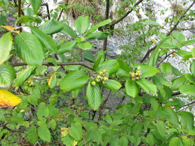 Многолетнее дерево высотой 10-15 метров. Светолюбиво, обычно растёт одиночно, на хорошо освещённых участках. Листья рябины круглолистной, в отличие от рябины обыкновенной, цельные, округло-эллиптические, кожистые, по окраске зелёные сверху и беловойлочные снизу. Цветки белые, крупные, собраны в щитковидные соцветия. Плоды красновато-оранжевые, с мучнистой мякотью, съедобные.
